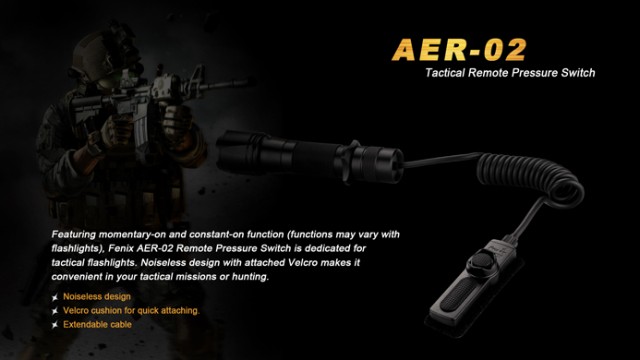 Featuring momentary-on, constant-on and output selection (functions may vary with flashlights?, Fenix AER-02 Remote Pressure Switch is dedicated for tactical flashlight. Noiseless design with attached Velcro makes it convenient in your tactical missions or hunting.