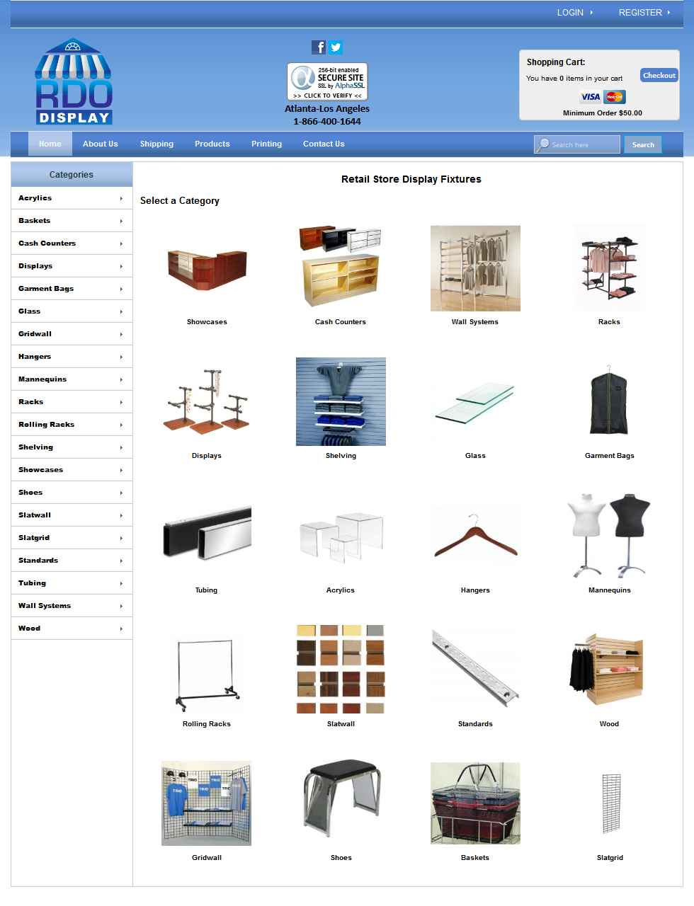 RDO is a retail store display fixture company with shipping or pickup facilities in Atlanta, Hazel Township Pennsylvannia, and Los Angeles. We provide new store space planning, fixturing hardware, showcases, cash counters, clothing racks, and wood table displays for visual merchandising.